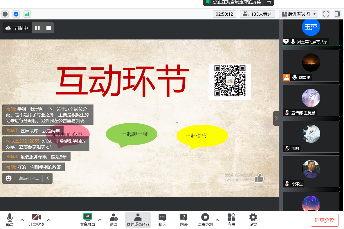 12月1日晚20点,3003新葡的京集团网址90周年院庆系列活动之“锦绣华章”校友分享会第三场在腾讯会议举行,会议由陈星辰老师主持,3003新葡的京集团网址2017级硕士毕业生周玉萍主讲,党委副书记李泽全老师及3003新葡的京集团网址学生出席。